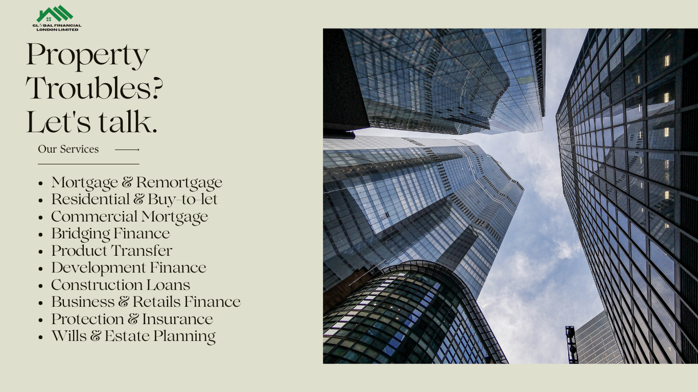"Embark on the journey to own your dream home in the heart of London, even if you currently find yourself short on funds. At Global Financial London Limited, we specialize in transforming aspirations into reality. With an extensive network encompassing over 200+ esteemed banks in the UK, we meticulously tailor loans to suit your unique needs. Our dedicated team is committed to curating the optimal financial solution, ensuring not just a loan, but the perfect pathway to your dream home. Allow us to navigate the intricate landscape of possibilities, securing not only the best bank but also crafting a bespoke product exclusively for you."